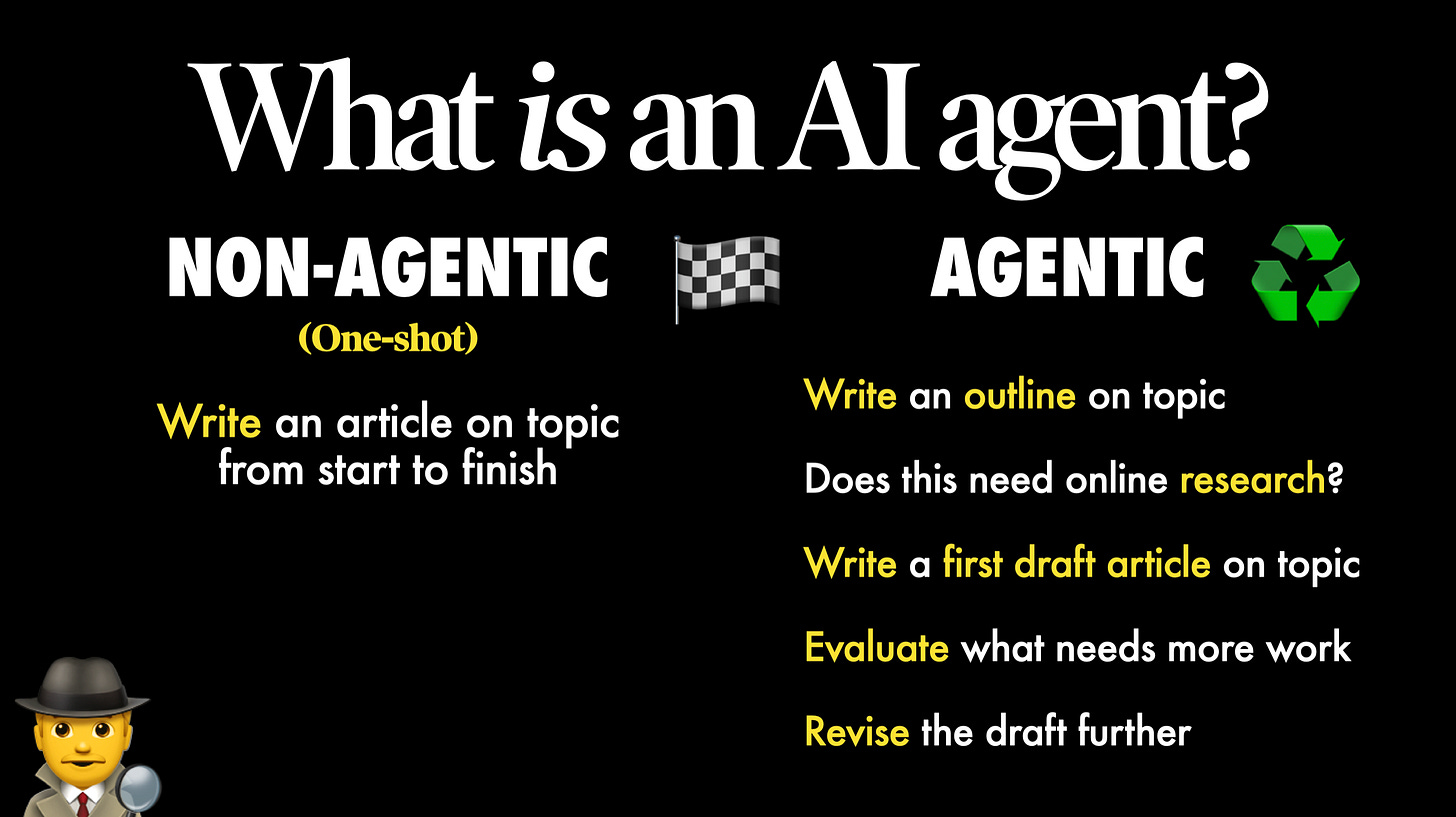 考虑一下我们今天如何使用 AI 聊天界面。你可能会要求 ChatGPT 从头到尾写一篇文章,然后得到一个单次响应。你可能需要自己做一些工作来迭代它。Agent 版本更加细致——Agent 可能会写一个大纲,决定是否需要研究,写一个草稿,评估是否需要改进并自我修订。让我们看看一些 Agent 实际运行的例子。