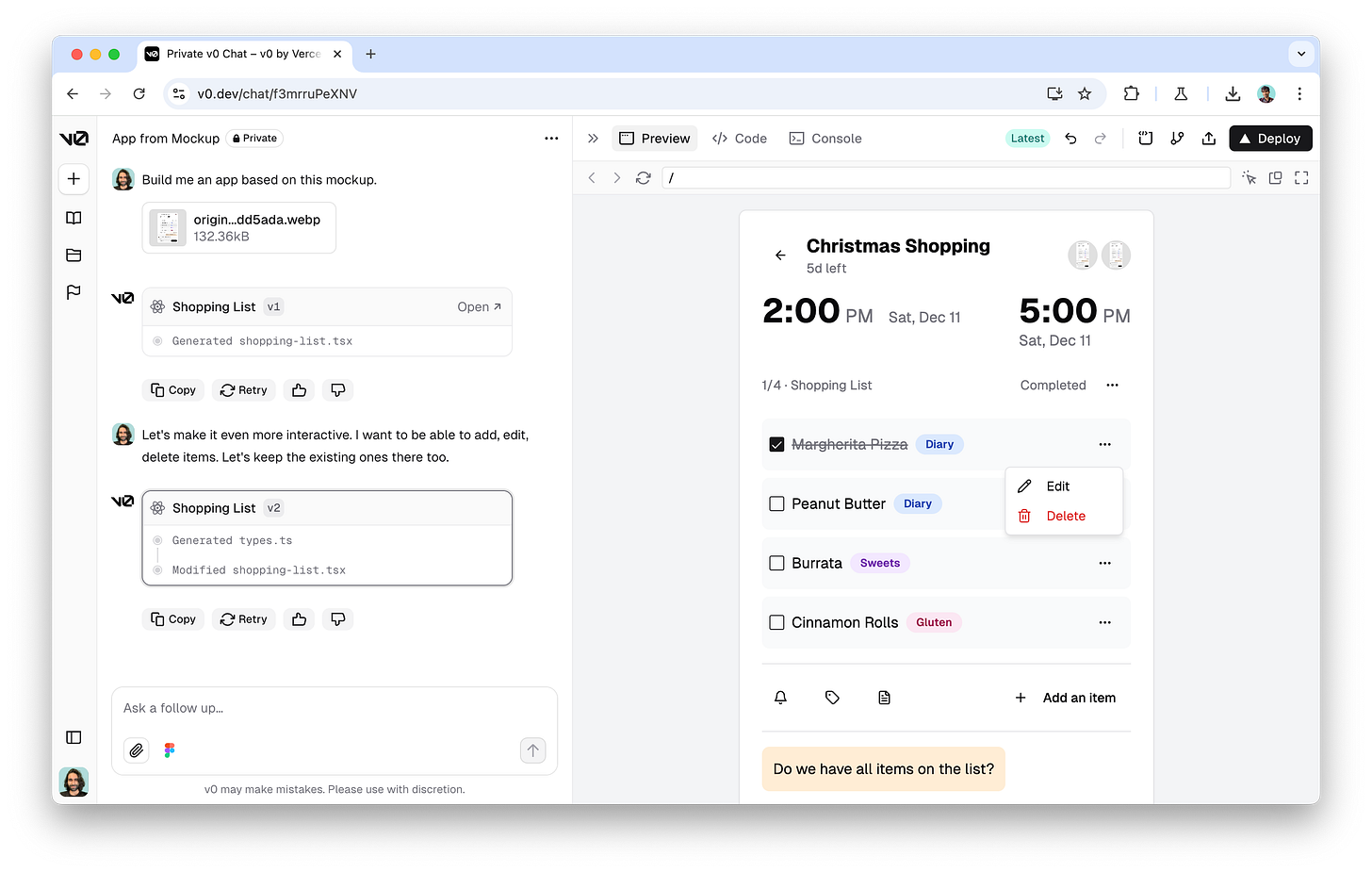 我经常先给 v0 一个参考稿——要么上传图片,要么直接喂 Figma 设计——再通过几轮提示,把交互细化到我满意的程度。如果你愿意把设计往后放,纯文本提示也能起步。若原型需要持久化能力,v0 也能配合 Prisma 一类方案把数据模型先搭起来。