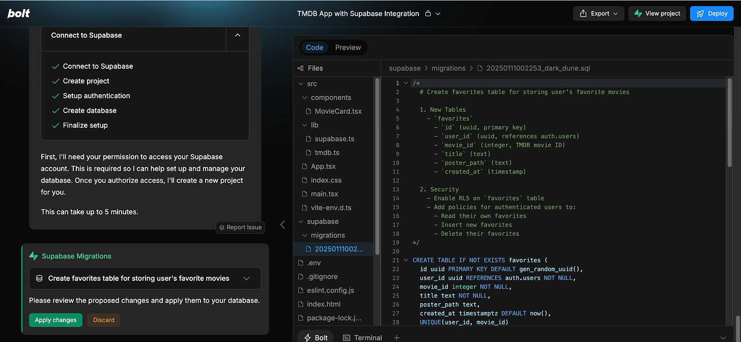 我用 Bolt 做过不少东西,从带认证、存储能力的 React + Tailwind 全栈应用,到调用浏览器内 AI 模型、WASM 的更复杂原型,整体体验都不错。和 v0 一样,它也支持把图片、文件一起作为提示输入。它与 Supabase 的集成做得比较顺,省去了不少手工建表和对接的步骤。
